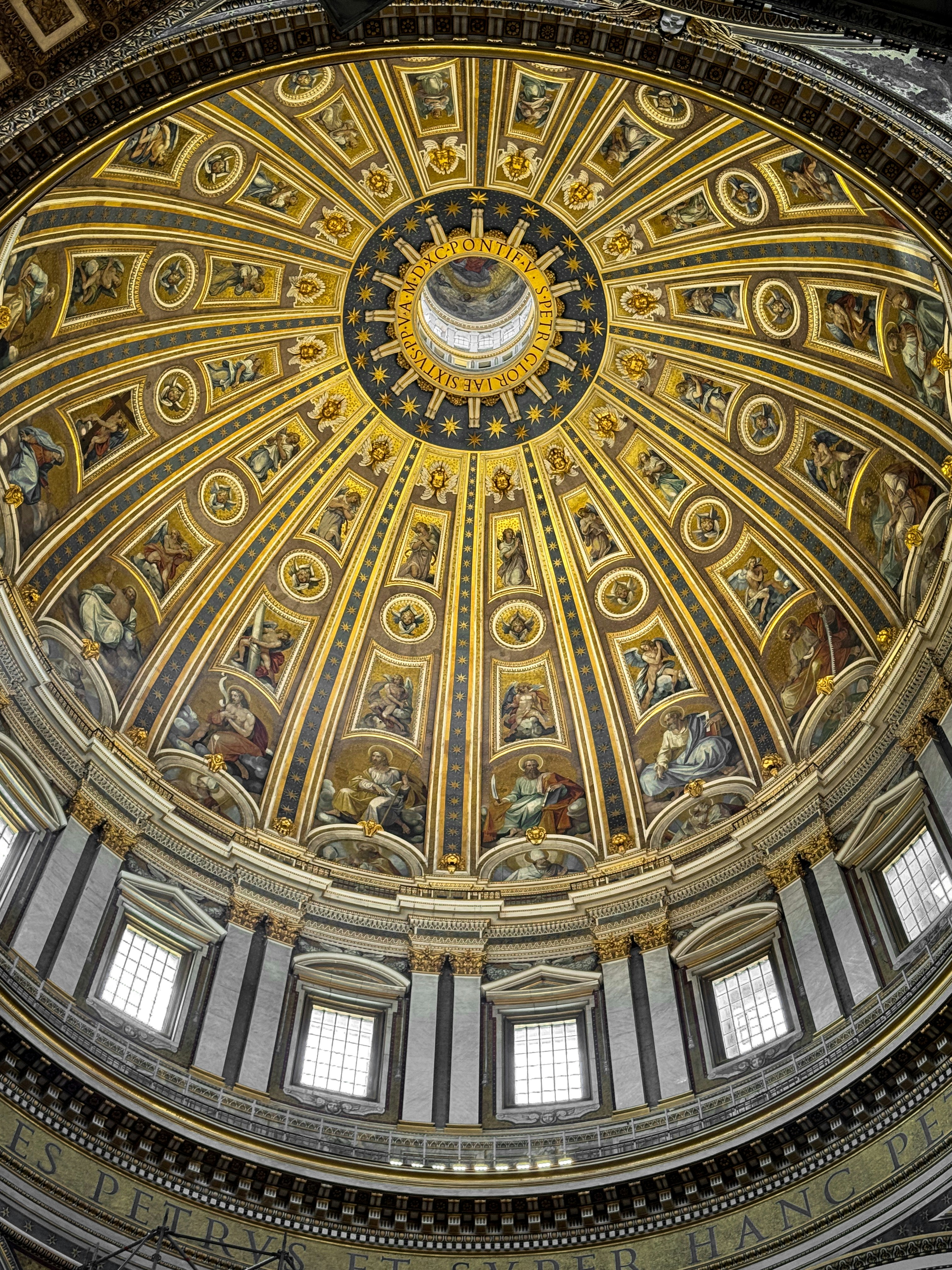 The internal gallery (first stop inside the dome): Before the final ascent to the external lantern, there is a gallery inside the dome at the level of the drum, from which you can look straight down into the basilica interior. The scale from this perspective is extraordinary. The people on the floor below appear miniature. The golden mosaics covering the interior of the dome can be seen at close range.